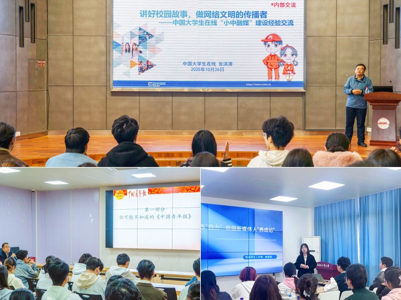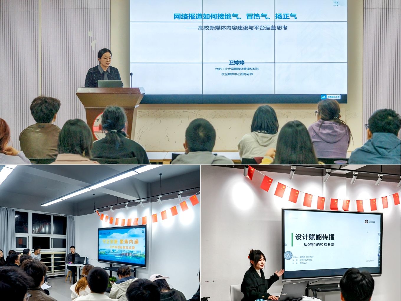 名师授课拓视野,启思赋能促知行。训练营邀请教育部中国大学生在线新媒体首席编辑张洪涛,中国青年报安徽记者站站长、高级记者王磊,党委学生工作部副部长、安徽省网络教育名师鲍丽娟分别围绕网络文明素养提升和媒介素养培育作专题报告,引导同学们筑牢价值根基,用好校园平台讲好工大故事,传递青年新声。