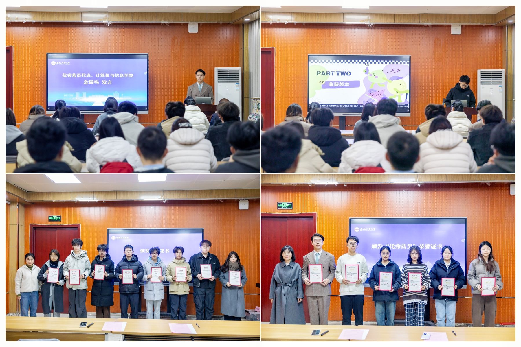 学以致用再出发,结营仪式启新程。12月24日下午,训练营结营仪式在屯溪路校区第二宣讲厅举行。仪式上,计算机与信息学院危展鸣同学作为“优秀营员”代表发言,优秀作品创作者刘浩洲做经验分享。与会领导老师依次为训练营学员颁发结业证书、为优秀营员代表颁发荣誉证书,并合影留念。党委学生工作部副部长鲍丽娟在总结讲话中指出,网络已成为青年成长成才的重要空间,共筑清朗校园网络空间是每位新媒体骨干义不容辞的责任,她希望同学们以结营为新的起点,继续做清朗网络的坚定捍卫者、网络正能量的积极传播者和网络文明的先锋引领者,在网络空间中坚守初心、勇担使命,为校园网络文明建设、为网络强国建设贡献工大学子的青春力量。