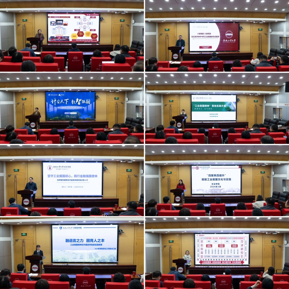 会上,机械工程学院、电气与自动化工程学院、计算机与信息学院、化学与化工学院、经济学院、文法学院、外国语学院、管理学院、建筑与艺术学院、资源与环境工程学院、食品与生物工程学院、数学学院、微电子学院、物理学院、软件学院等学院学生工作相关负责老师,紧扣学院学生思想特点与发展需求,通过“大国重器”实景教学、关键领域产学研实践、行业先锋榜样引领等务实举措,将工业报国精神融入价值引领、专业学习、科研创新和社会服务等各方面,形成工业报国使命引领下“一院一策”的创新性落实方案,呈现出兼具专业深度与价值温度的育人实践图景。