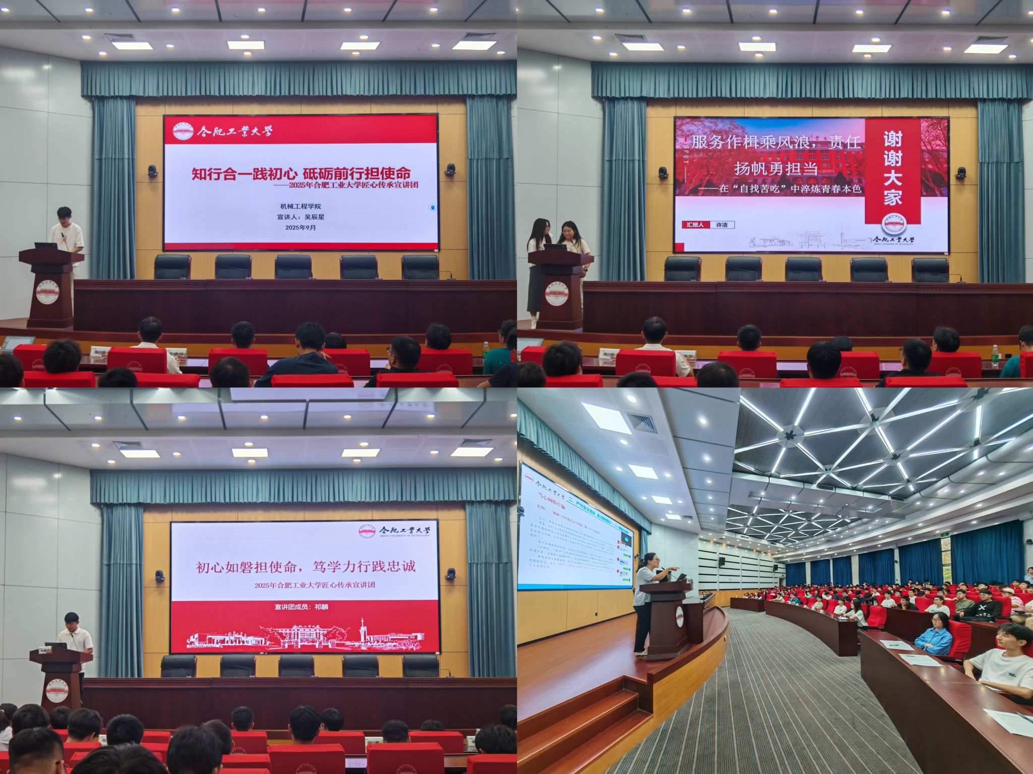 9月6日,学校“研途师说”巡讲团成员刘开阳老师、学校宣讲团成员许洁、吴辰星、祁麟、耿徐四位同学接力开讲。刘开阳老师以“知校史明校情,秉校训勇担当”为题,介绍了历届工大人在办学兴校中践行“工业报国”使命的学校历史沿革,着重阐释了人才培养特色等校情知识。我院许洁同学以“服务作舟乘风浪,责任扬帆勇担当”为题,讲述了她在“自找苦吃”中淬炼青春、锤炼担当的成长历程;机械工程学院的吴辰星同学围绕“知行合一践初心,砥砺前行担使命”,分享了个人求学奋进、实践报国的成长感悟;我院祁麟同学以“初心如磐担使命,笃学力行践忠诚”为主题,交流了他在科研探索与社会实践中的心得体会;汽车与交通工程学院的耿徐同学则以“青春赛道勇担时代使命——在服务中书写价值”为题,阐述了在服务奉献中实现青春价值的深刻体悟。