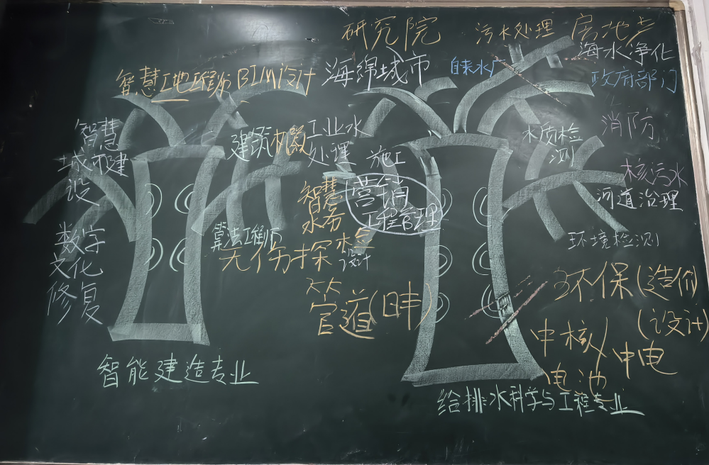 在“绘制专业树”环节,同学们以小组为单位,围绕所学专业的知识体系、核心课程、技能要求及未来发展方向展开热烈讨论。各组代表依次上台共绘“专业树”。不同视角的碰撞让同学们对专业的广度与深度有了更立体的认知。这一环节不仅帮助同学们系统梳理了专业知识架构,更引导大家跳出课本局限,将所学与行业需求、国家战略相结合,深刻体悟到专业背后的时代使命与社会责任。