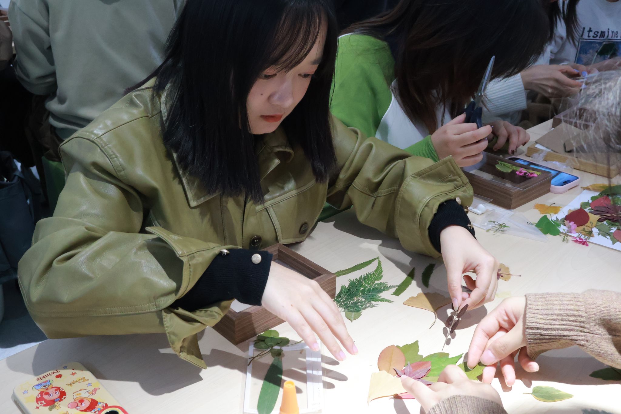 活动伊始,朱曼婷介绍了树叶拼贴的疗愈理念,随后引导同学们通过剪裁、拼接树叶创作作品,在动手实践中梳理情绪、释放压力。创作过程中,同学们结合叶片纹理与色彩,构思出各具风格的作品,现场氛围轻松愉悦。经过一个小时的创作,普通落叶在同学们手中蜕变为兼具创意与个人情感的拼贴作品,每一幅都承载着对自然的观察及自身情绪的释放。