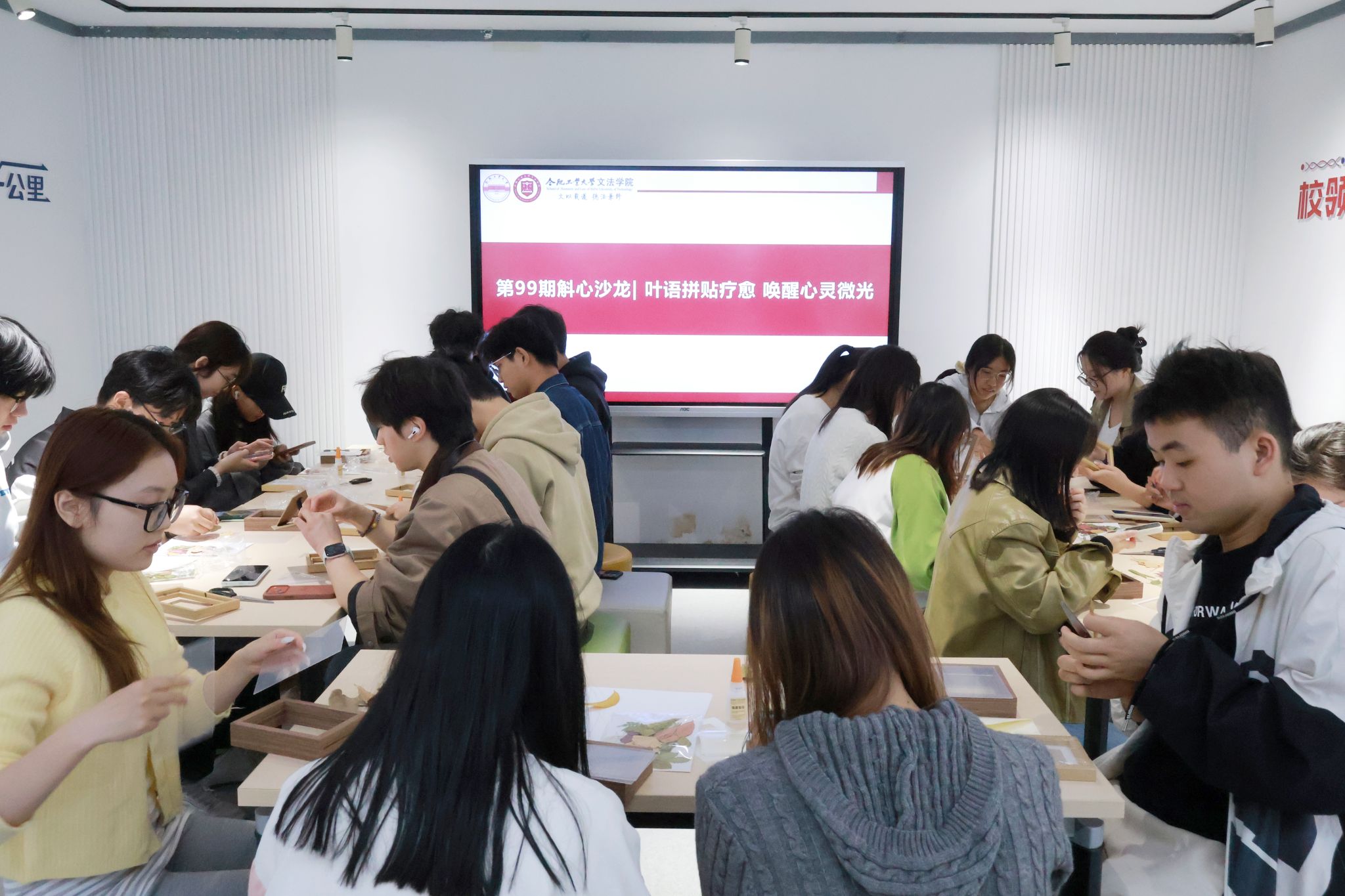 为帮助研究生群体疏解情绪、感受自然疗愈力量,11月5日,由文法学院承办的第99期“斛心沙龙”在本科生公寓七号楼二楼学生社区举行。本次活动以“叶语拼贴疗愈,唤醒心灵微光”为主题,学院大学生发展辅导中心主任朱曼婷主持,学校24名研究生报名参与。