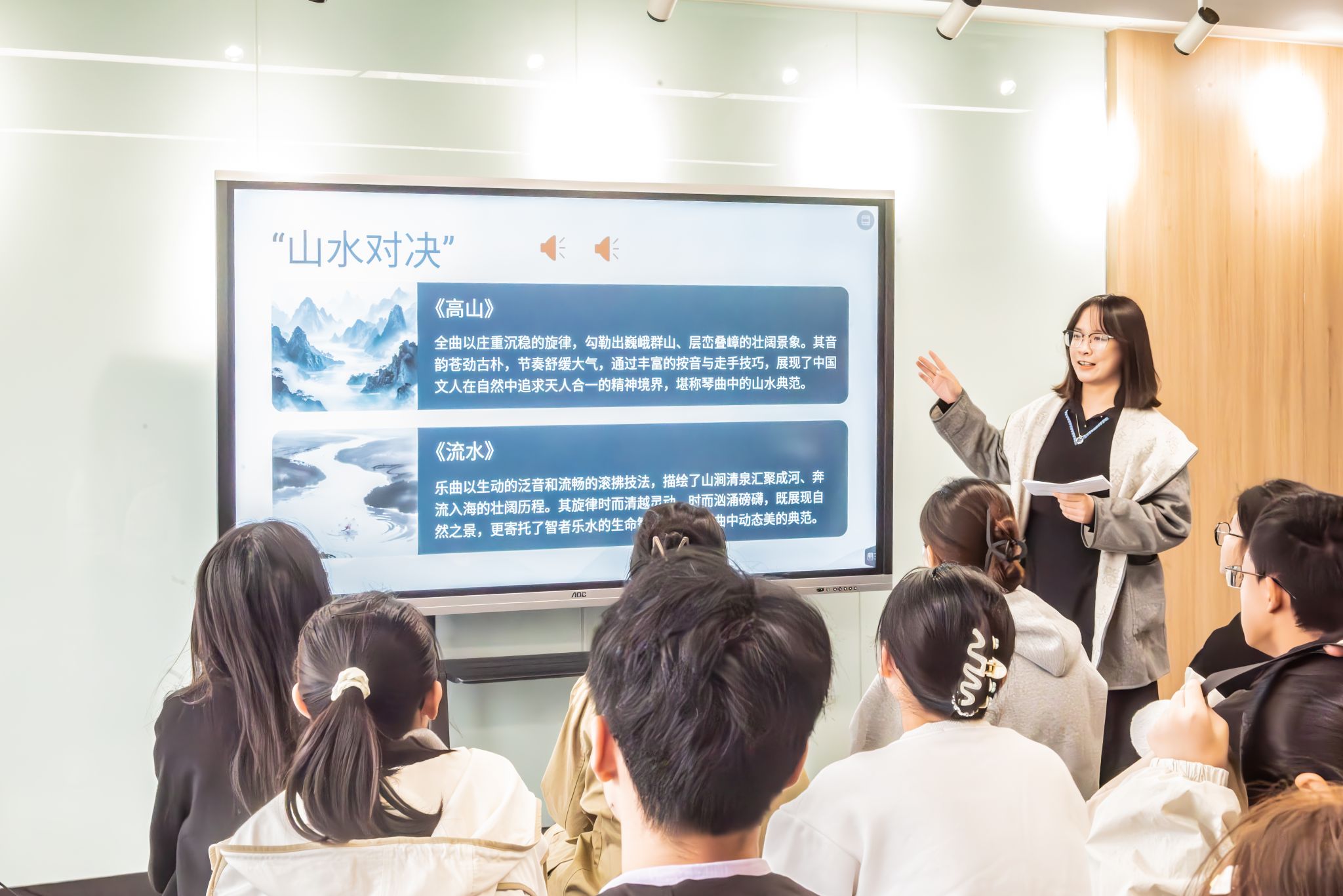 在“一曲一故事”经典赏析环节,主讲人依次导赏了《流水》《广陵散》《平沙落雁》《酒狂》等名曲,结合创作背景、乐曲意境与文化典故进行深入解读。《流水》的泛音清越,勾勒出山涧奔涌的生动意象;《广陵散》气势恢宏,传递着古代侠士的悲壮气节;《平沙落雁》则以悠远绵长的走手音,营造出空灵淡泊的秋江画卷。每曲终了,现场皆掌声不断,气氛庄重而热烈。随后的趣味问答环节,同学们踊跃参与,现场气氛热烈。