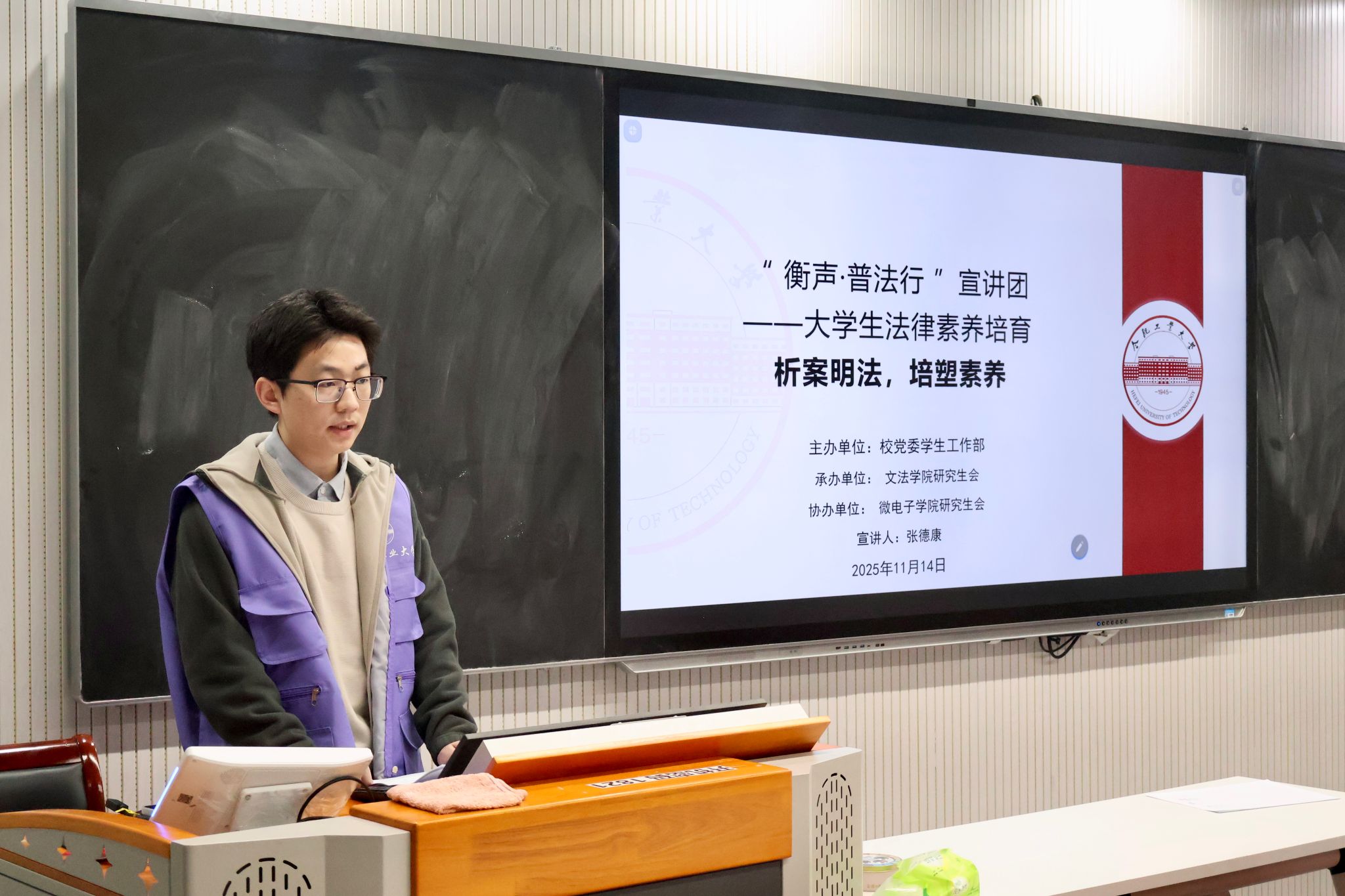 为帮助大学生实现从“权利意识”到“法律能力”的转变,11月14日,文法学院“衡声·普法行”宣讲团于科教楼举办“守护青春权益,提升法律素养”主题普法活动,由张德康主讲,微电子学院研究生参与。