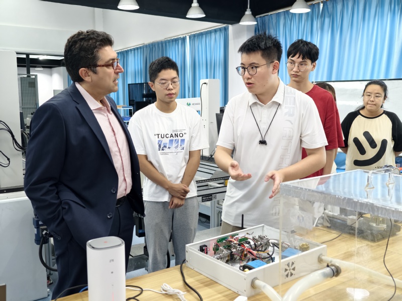 之后,创新实践中心成员们为到访三人展示了采用瑞萨单片机制作的握力计、手势识别小车、无水箱微环境恒湿设备以及油压监测系统。Hooman Foroughi对展示的作品做出了高度评价,并和创新实践中心成员们交流了开发细节与使用感受等内容。