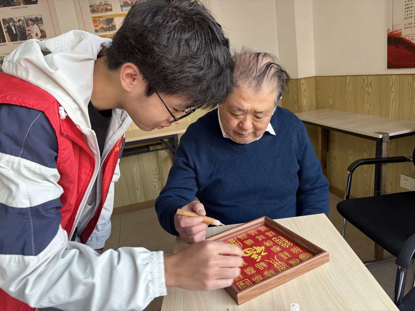 活动现场暖意融融,志愿者们早已备齐描金工具与相框素材,全身心投入到服务中。面对老人们在操作中遇到的各类问题,志愿者们俯身为其答疑解惑,手把手纠正握笔姿势、调控出墨力度,对动作不便的老人更是细心协助完成关键步骤。在一问一答、一笔一画的互动中,承载“福禄寿喜”美好祝愿的作品逐渐成型,老人们脸上洋溢着成就感与幸福感,现场满是欢声笑语。