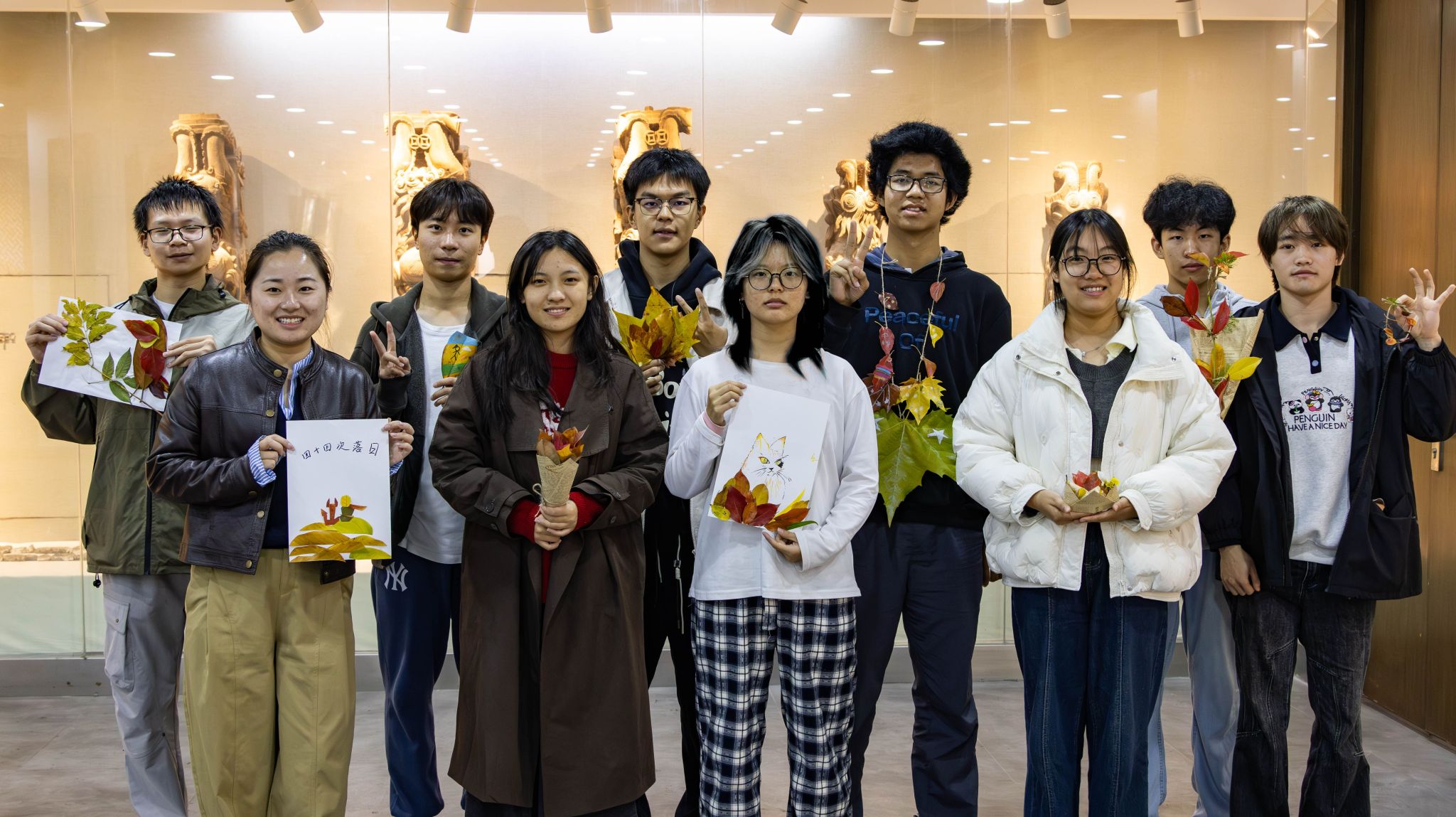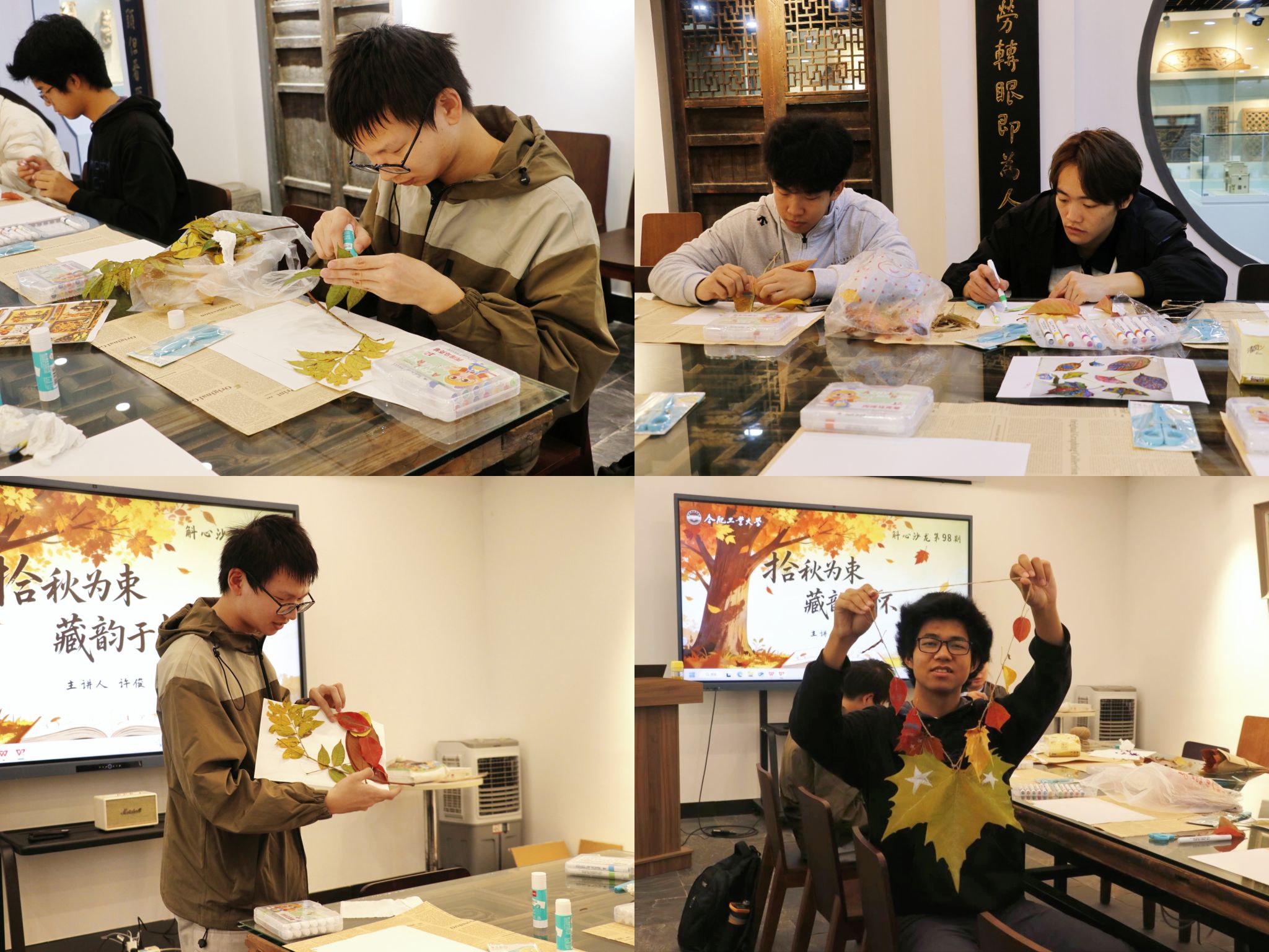 本次活动设置“讲解—探索—创作—分享”四部分。活动伊始,许俊老师以秋末校园为背景分享“以落叶为媒、以手作为桥”关照自我的理念,鼓励同学们在自然与创作中感受宁静与治愈。在探索阶段,大家漫步校园,小雨淅沥,拾起片片落叶,作为自己独一无二的创作素材。拾叶归来,同学们或执笔在叶片上勾勒秋景,或将落叶拼贴成画,更有巧手者以麻绳、报纸等材料创作出立体手工作品。分享环节,同学们依次展示手作并分享感受,“淋雨捡叶体验了别样的秋季之美”“创作时短暂忘却了学业压力”的真挚分享引发共鸣。