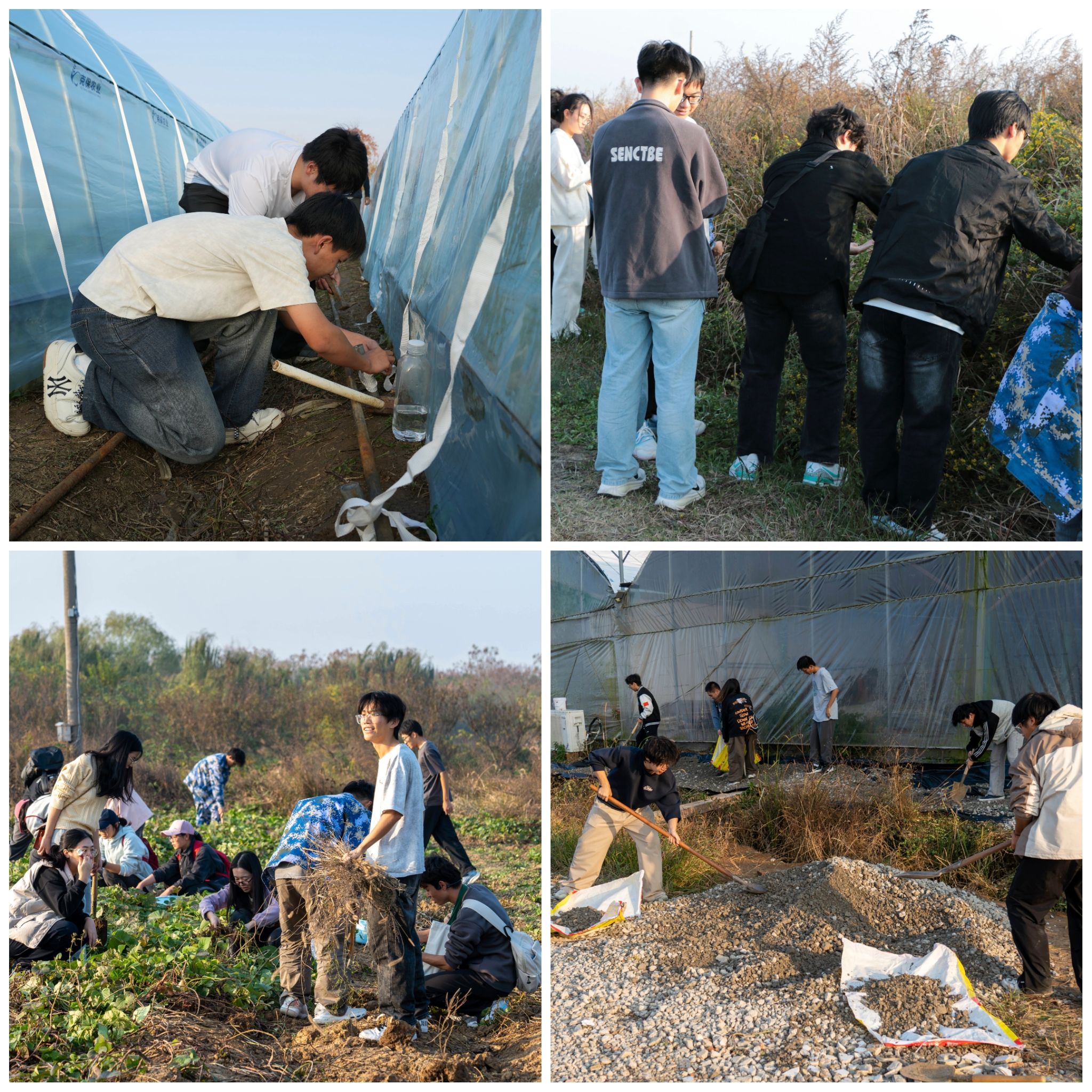 此次劳动实践共有五个实践项目,同学们以班级为单位,在农场师傅和各班班主任的带领下,逐步分流向农场的不同区域开展劳动实践。食科25-1班和食科25-2班躬身于田埂地头播种蚕豆、翻挖红薯;药学25-1班、制药25-1班和制药25-2班穿梭于田间,采摘野菊花;食安25-1班和食安25-2班跟随着农场师傅,帮助完成安装固定蔬菜大棚;生物技25-1班和生工25-1班在农场师傅的指导下,为烧饭大棚边水沟一侧铺上防潮布和石子。劳动现场气氛欢乐融洽,师傅的讲解声、同学的欢笑声交织,三三两两的学生组团分工,在合作中学习劳动的知识,体验劳动的快乐。