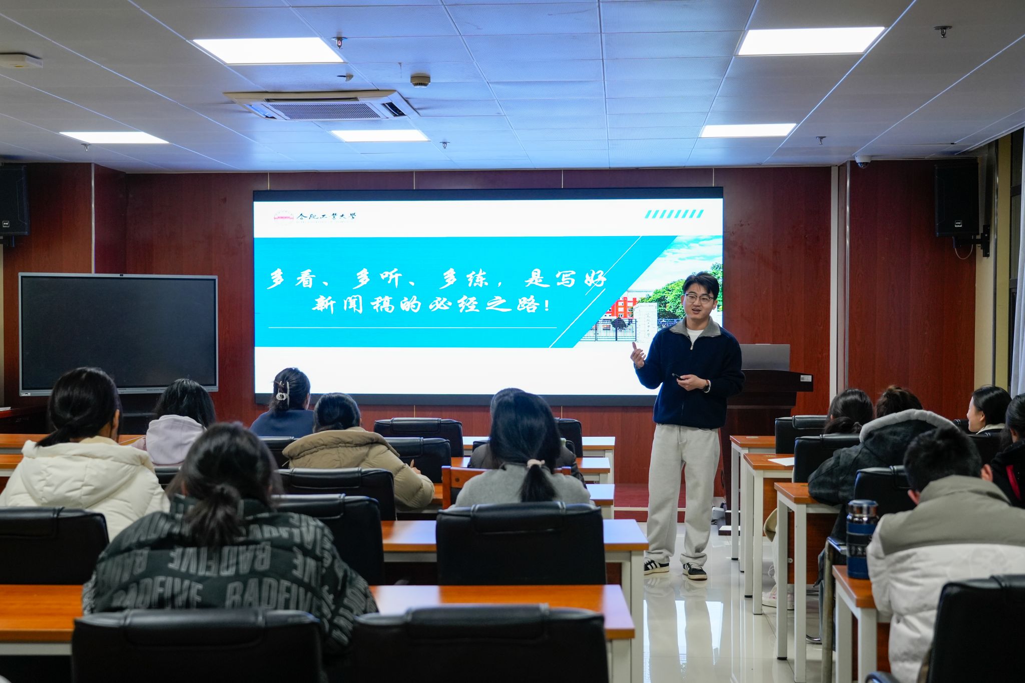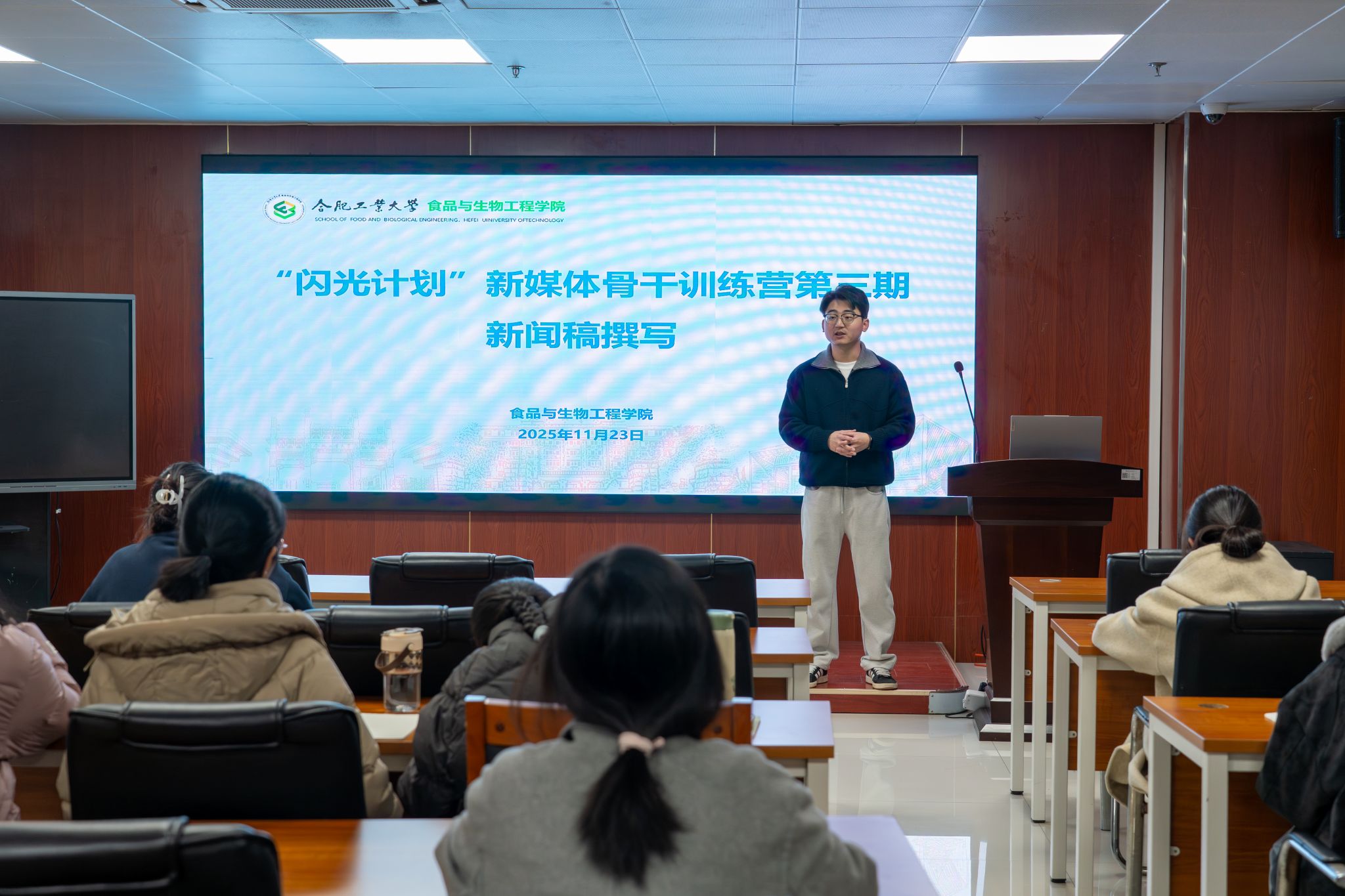 11月23日晚,食品与生物工程学院在食生楼206室开展“闪光计划”第三期新媒体骨干培训——《新闻稿撰写》专题讲座。本次培训由2025级新生辅导员、“食”光网络文化工作室指导老师乐圣粤主讲,全院大一大二新媒体中心学生骨干30余人参加。