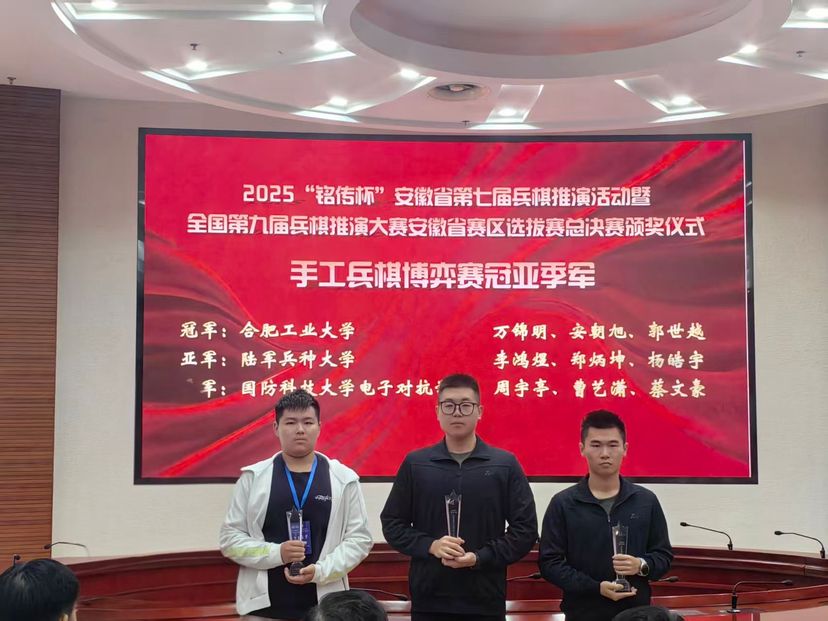近日,“铭传杯”安徽省第七届兵棋推演活动暨全国第九届兵棋推演大赛安徽省赛区选拔赛决赛在合肥举行。本次大赛分为计算机兵棋主体赛与手工兵棋博弈赛两个赛道,共有来自全省军地院校的529支编队、1179名选手参与。我校学子在比赛中表现优异,荣获手工兵棋博弈赛冠军1项、三等奖1项和计算机兵棋主体赛三等奖1项,学校荣获“优秀组织单位”。