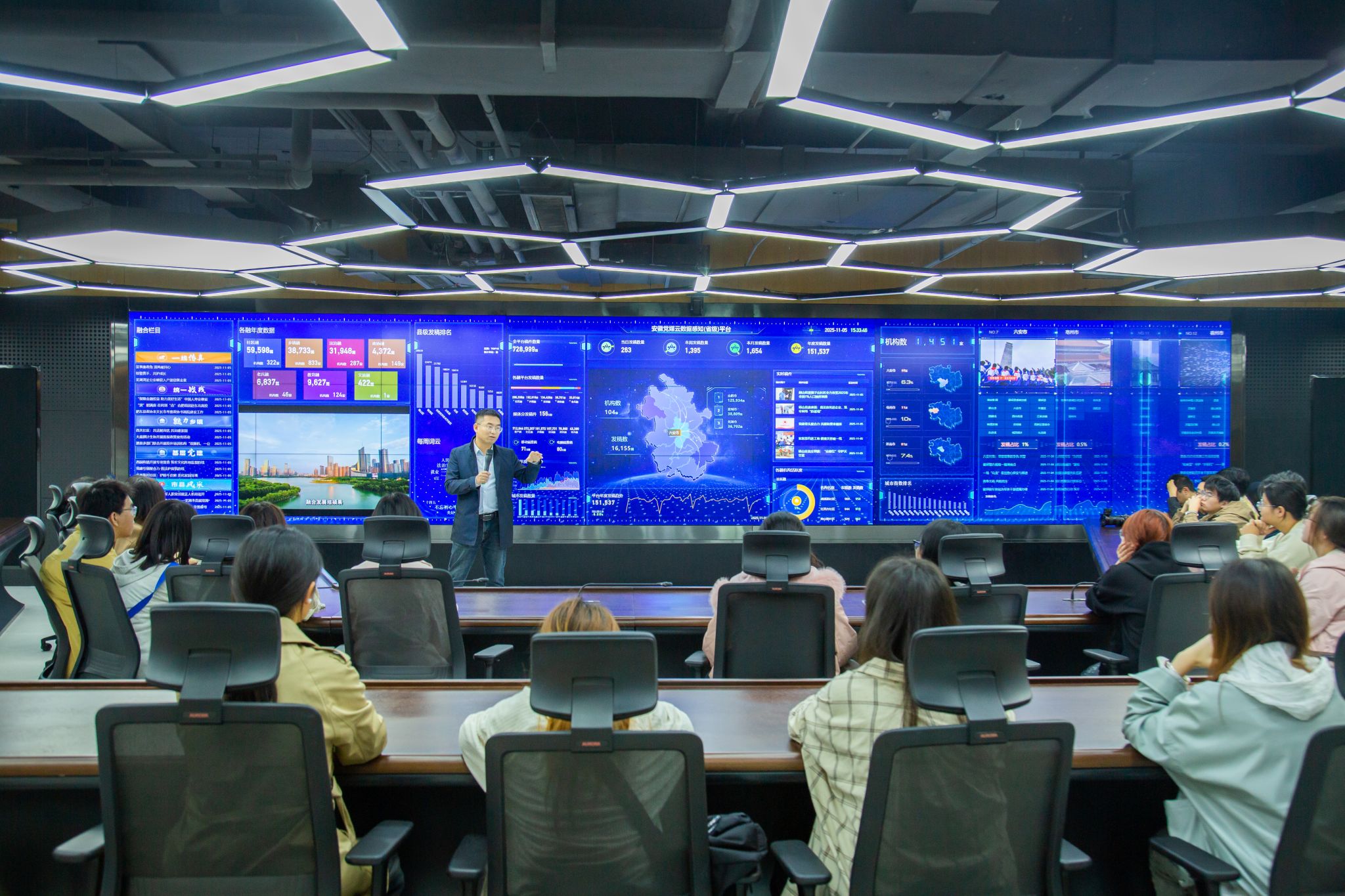 师生一行在安徽日报社相关负责同志的指引下参观了安徽日报社报史馆,通过文献资料、历史图片、实物展品及多媒体演示等,系统了解了安徽日报社自创办以来的发展历程、办报理念与时代担当,深刻感受到主流媒体在记录时代变迁、传播主流声音、服务社会发展中的重要作用。随后,师生走进安徽日报社融媒体中心,实地观摩全媒体内容生产、编辑审核、多平台分发的全流程。在融媒体指挥调度中心,安徽日报报业集团融媒发展中心主任李跃波详细介绍了中心在整合媒体资源、运用新技术赋能新闻传播、打造融媒体产品等方面的创新实践,展示了主流媒体如何通过“报、网、端、微、屏”多渠道融合,实现新闻内容的精准传播与影响力提升。参与活动的师生纷纷表示此次走访收获颇丰,不仅拓宽了视野,加深了对主流媒体发展趋势的理解,更明确了校园媒体的定位与使命。