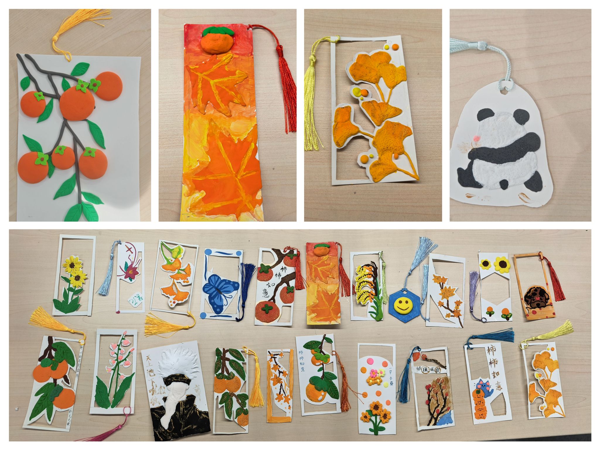 创作完成后,同学们分享了书签背后的故事:有的结合近期学业压力,将书签命名为“柿柿安”;有的寄托对亲友的祝福,赋予其“万柿胜意”的期许。一枚枚形态各异的立体书签,不仅是实用的阅读伴手物,更承载着个体的情绪与温度。活动尾声,大家手持书签合影留念,定格了霜降时节独有的温暖时刻。