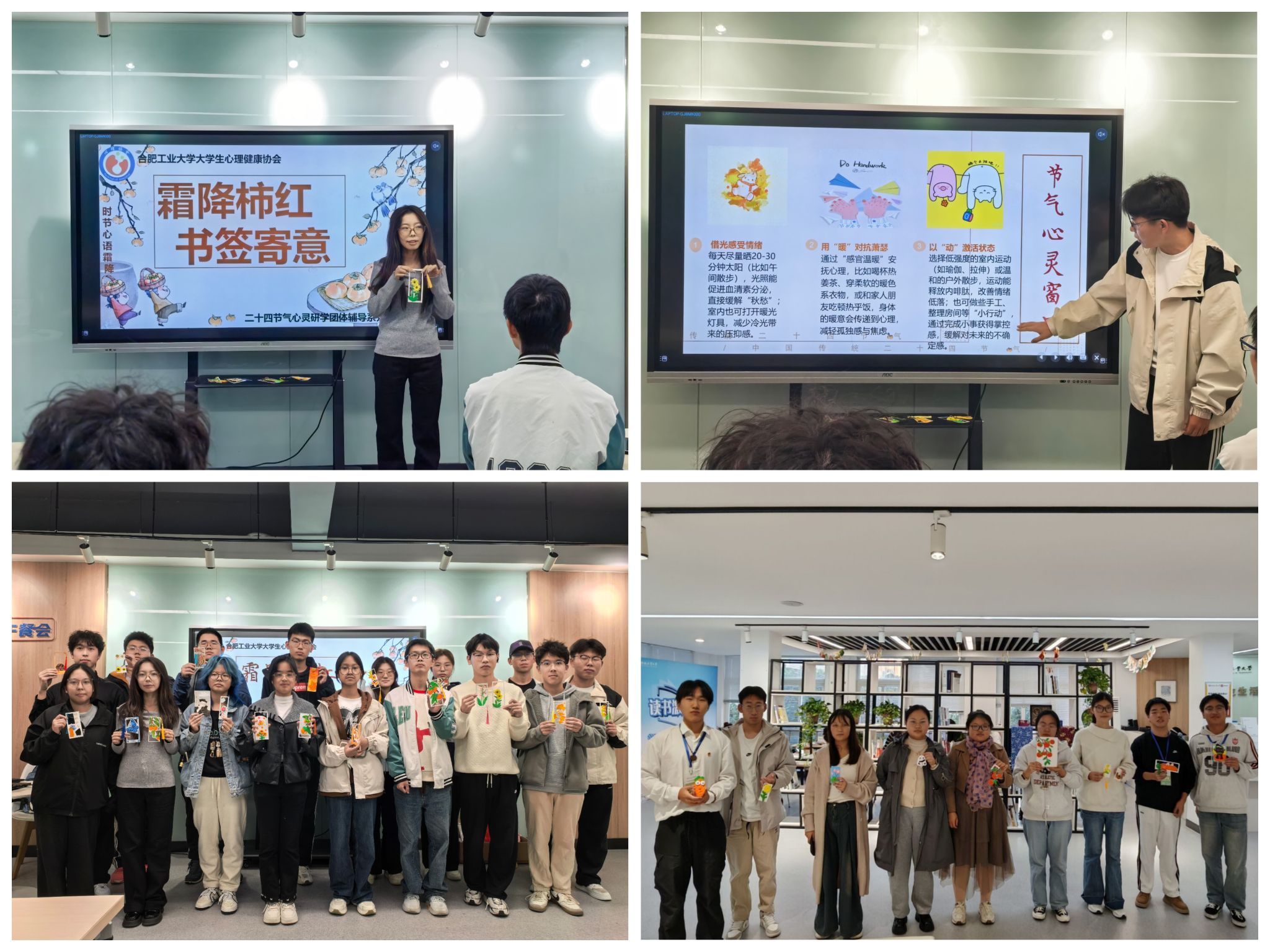 10月22日下午,党委学生工作部(处)心理健康教育中心在屯溪路校区与翡翠湖校区同步开展二十四节气“时节心语”霜降篇——“霜降柿红,书签寄意”黏土书签创意工坊活动。来自两校区的三十余名同学在文化共鸣与指尖塑型中,开启了一场秋意里的心灵舒缓之旅。