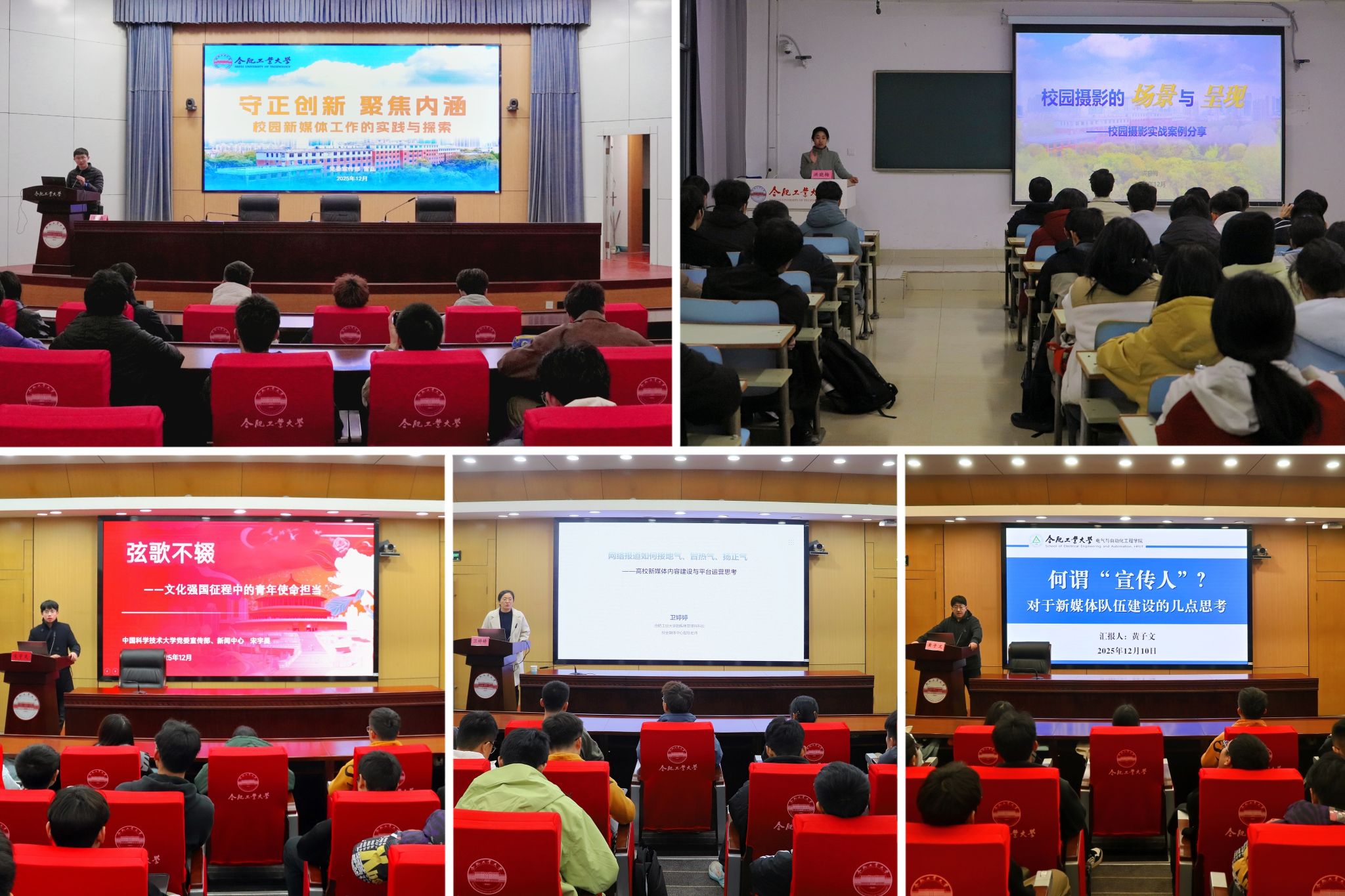 校党委宣传部新闻采编科科长雷磊以《守正创新,聚焦内涵——校园新媒体工作的实践与探索》为题,围绕新媒体时代特点、新媒体工作本领、新媒体运营法则等方面展开讲授。校党委宣传部融媒体管理科科长卫婷婷以《网络报道如何接地气、冒热气、扬正气》为题,阐述了高校融媒体矩阵运营、热点选题与线索捕捉、新媒体特色文化品牌打造等内容。校党委学生工作部智慧学工科科长洪晓梅以《校园摄影的“场景”与“呈现”》为题,讲解了摄影构图、曝光元素、图像处理等技巧,并剖析了各类会议活动的影像记录实例。中国科学技术大学党委宣传部、新闻中心教师宋宇昊作《弦歌不辍——文化强国征程中的青年使命担当》主题交流,鼓励青年学子坚定文化自信,以昂扬姿态参与校园宣传工作。学院新媒体指导教师黄子文作《对于新媒体队伍建设的几点思考》主题分享,勉励团学骨干在宣传实践中付出真心情怀,锻造一支向上向美、融情融力的新媒体队伍。