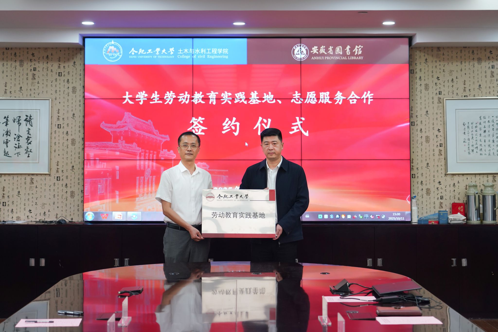 随后,学院党委副书记、纪委书记关茜与安徽省图书馆党委委员、副馆长董松代表双方签订志愿服务协议以及劳动教育实践基地协议,学院党委书记王东坡与安徽省图书馆党委书记、馆长左金刚为劳动教育实践基地揭牌。