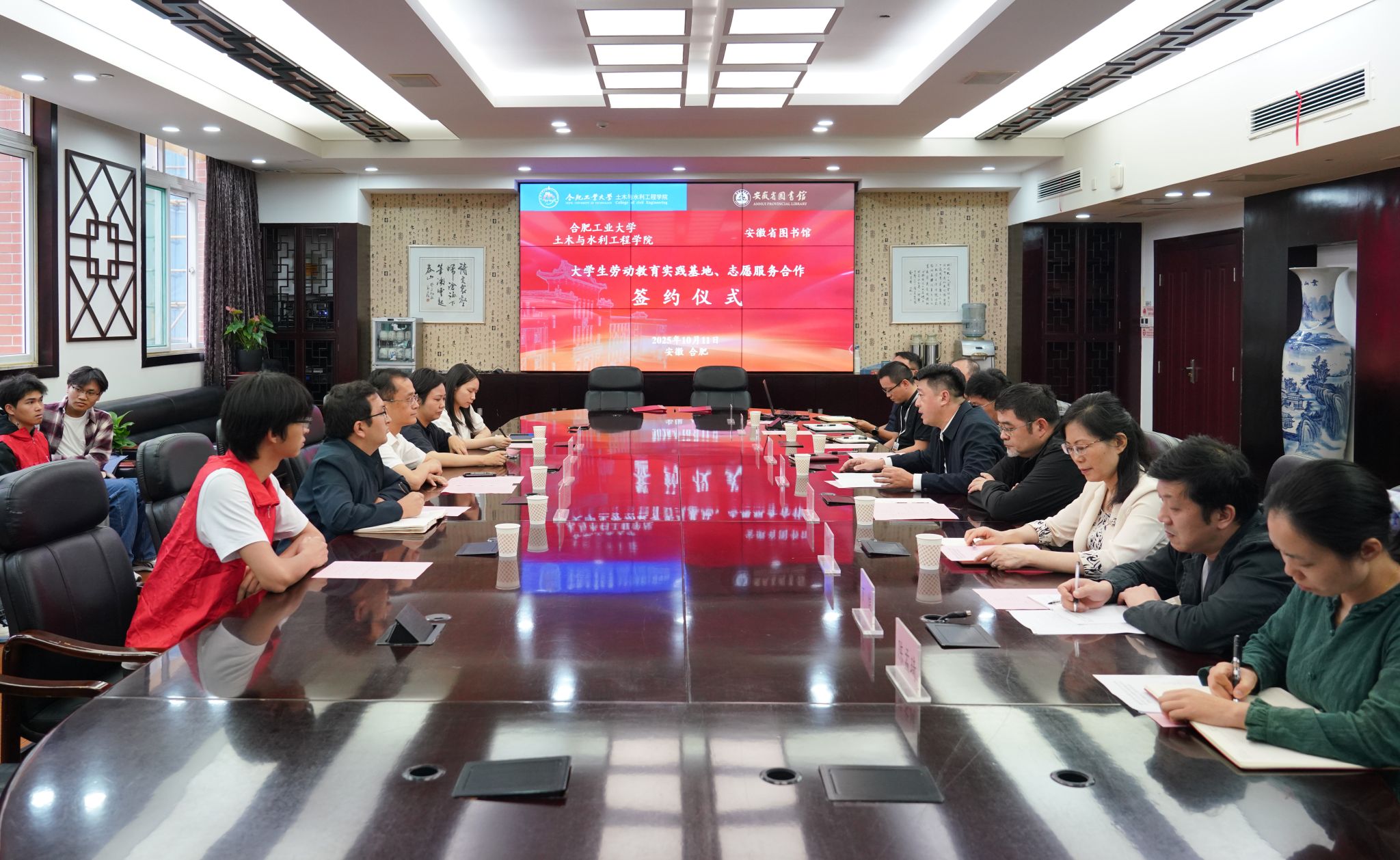 安徽省图书馆党委书记、馆长左金刚向土木与水利工程学院一行表示热烈欢迎,并详细介绍了安徽省图书的发展历程、服务布局以及志愿服务相关工作。学院党委书记王东坡代表学院对安徽省图书馆为学生搭建实践平台表示感谢,并向共建单位介绍了学校基本情况、学院办学历史、并希望双方能进一步围绕党建、学生工作等方面强化校地资源共融联动、优化供给、打造品牌。会上,双方就未来开展劳动实践、志愿服务的具体内容进行了深入探讨,并希望在人才培养、科学研究等方面展开深度合作,实现双方互惠互赢。