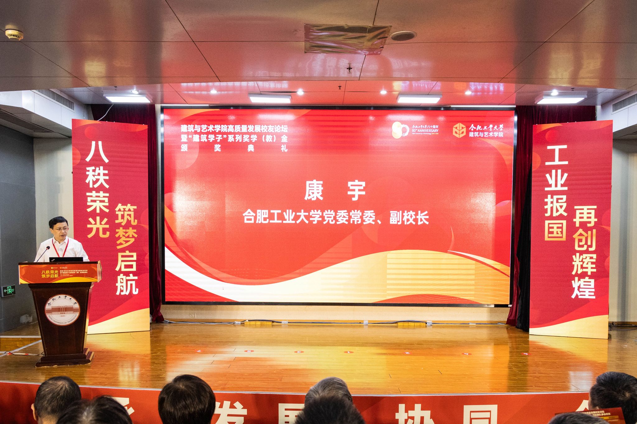 典礼在庄严的国歌声中拉开帷幕。康宇代表学校向广大校友、师生致以诚挚问候和衷心感谢。他指出,合肥工业大学建校80年来,始终与国家同频、与时代同行,为国家培养了50余万名优秀人才。建筑与艺术学院建院六十余年来坚守“德艺双馨、追求卓越、自觉服务国家和行业发展的创新型设计人才”的初心和使命,在人才培养、学科建设、科研创新和社会服务等方面成果丰硕。他希望学院能够锚定高质量发展目标,打造特色鲜明的一流学科体系;深化教育教学改革,培养德才兼备的卓越创新人才;汇聚校友磅礴力量,共绘学院发展新蓝图,全力打造具有全国影响力和区域引领力的高水平学院。